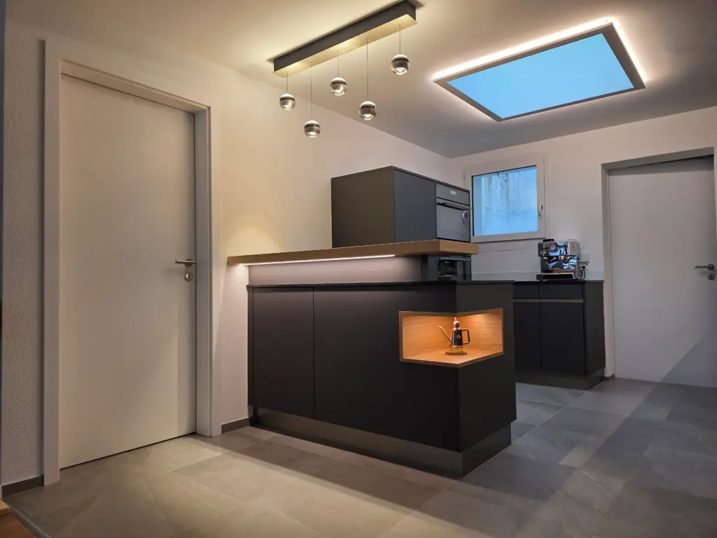 Die Arbeitsplatte aus Nero Angola ergänzt dieses Konzept perfekt. Das schwarze Hartgestein (Anorthosit) verleiht der Küche eine massive Wertigkeit und schliesst bündig an die matten Fronten an. Um dem Raum Wärme zu verleihen, haben wir die Bar und die Nische in schlichter Eiche ausgeführt. Diese Holzelemente lockern das Gesamtbild auf und schaffen eine wohnliche Atmosphäre.