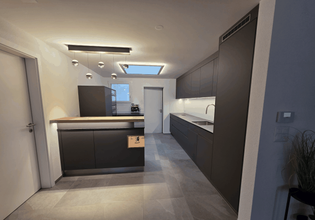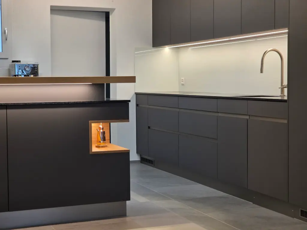 Bei dieser Küche in Bütschwil haben wir dunkle Fronten mit einer hochwertigen Anti-Fingerprint-Beschichtung eingesetzt. Die matte Oberfläche sorgt nicht nur für eine moderne Optik, sondern ist im Alltag besonders pflegeleicht. Diese dunklen Elemente bilden die Basis und verschmelzen ruhig mit den Akzenten aus natürlicher Eiche.